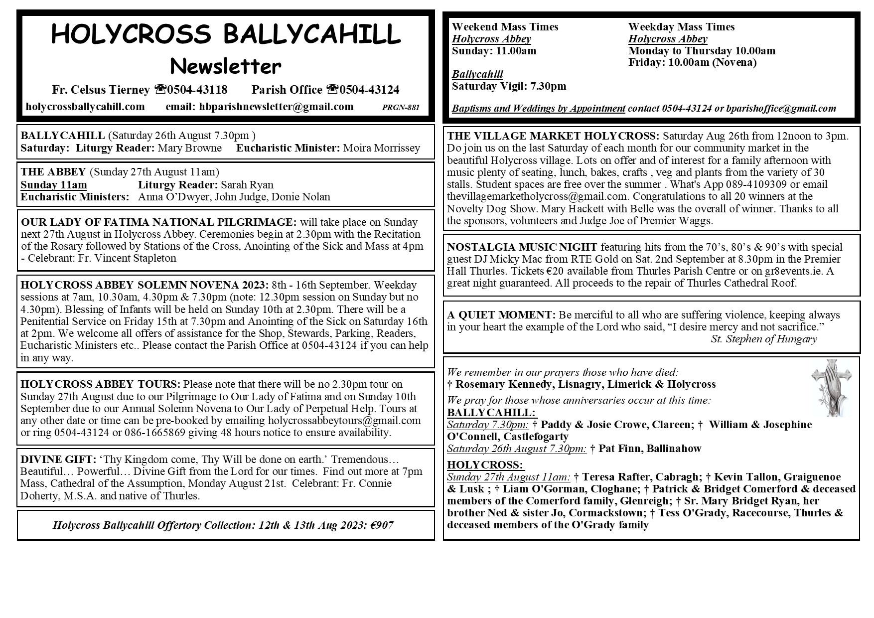 Parish Newsletter 20th August 2023 adminAugust 18, 2023August 18, 2023 Uncategorized 20th-August-2023-parish-newsletter-1Download ← HOLYCROSS ABBEY SOLEMN NOVENA 2023 John Tierney R.I.P. →